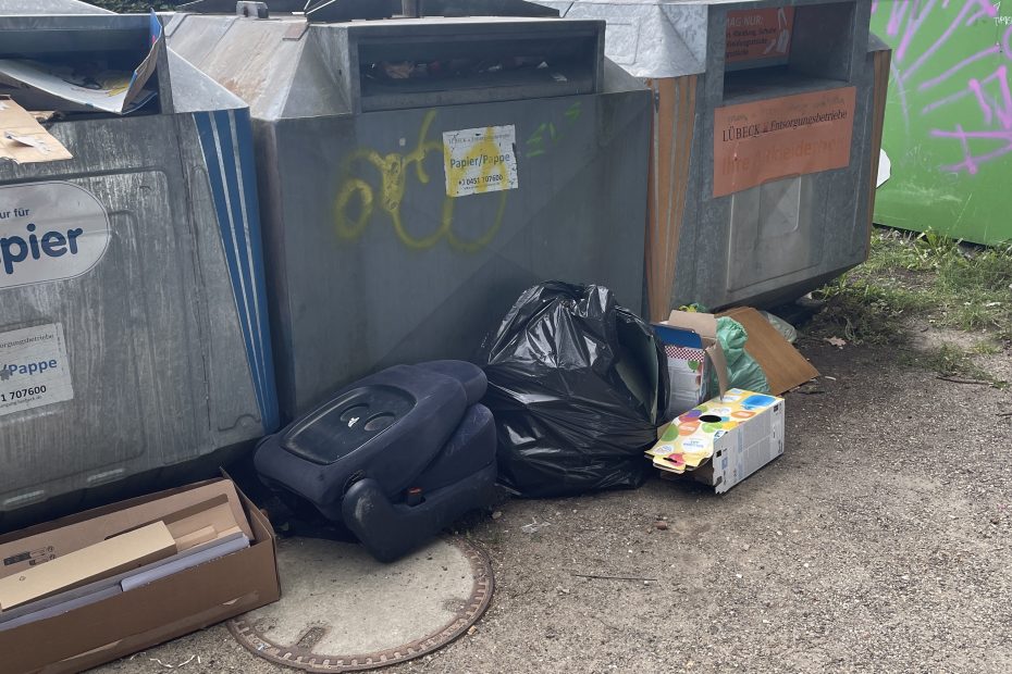 Das Abstellen von Haus- oder Sperrmüll auf einem öffentlichen Containerplatz (zum Bespiel bei der Bushaltestelle Forstmeisterweg) in Lübeck ist nicht erlaubt, da diese Plätze ausschließlich für die Entsorgung von Papier und Glas bestimmt sind. Diese illegale Müllablagerung führt zu erheblichen Umweltbelastungen: Schadstoffe aus dem Müll können Boden und Wasser verunreinigen, Tiere gefährden und Mikroplastik in die Umwelt freisetzen. Zudem entstehen durch die Entsorgung zusätzliche Kosten, die über die Umlage wir alle als Gebühren bezahlen müssen.